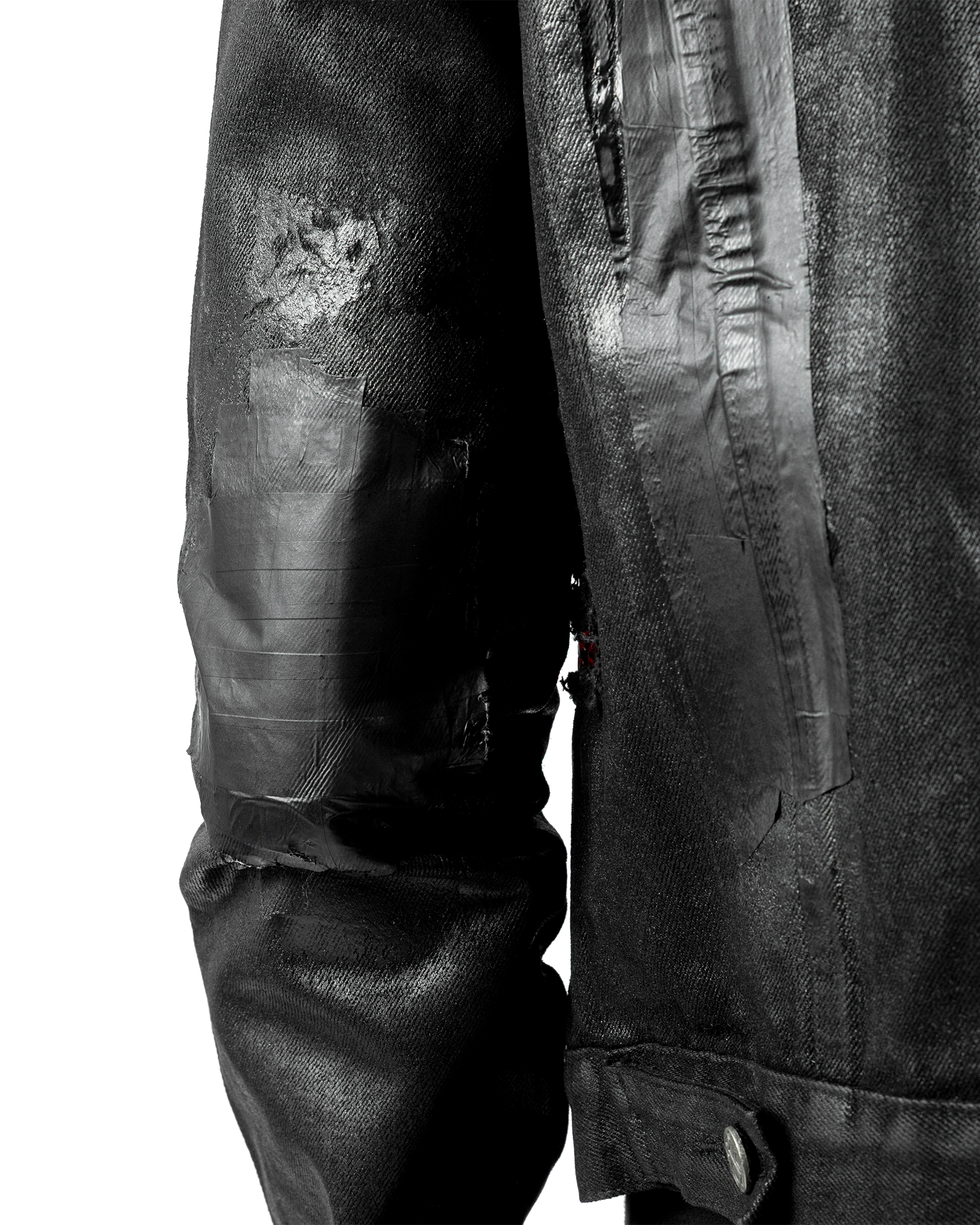 - Custom gunmetal hardware (front placket, cuffs, hem adjusters)