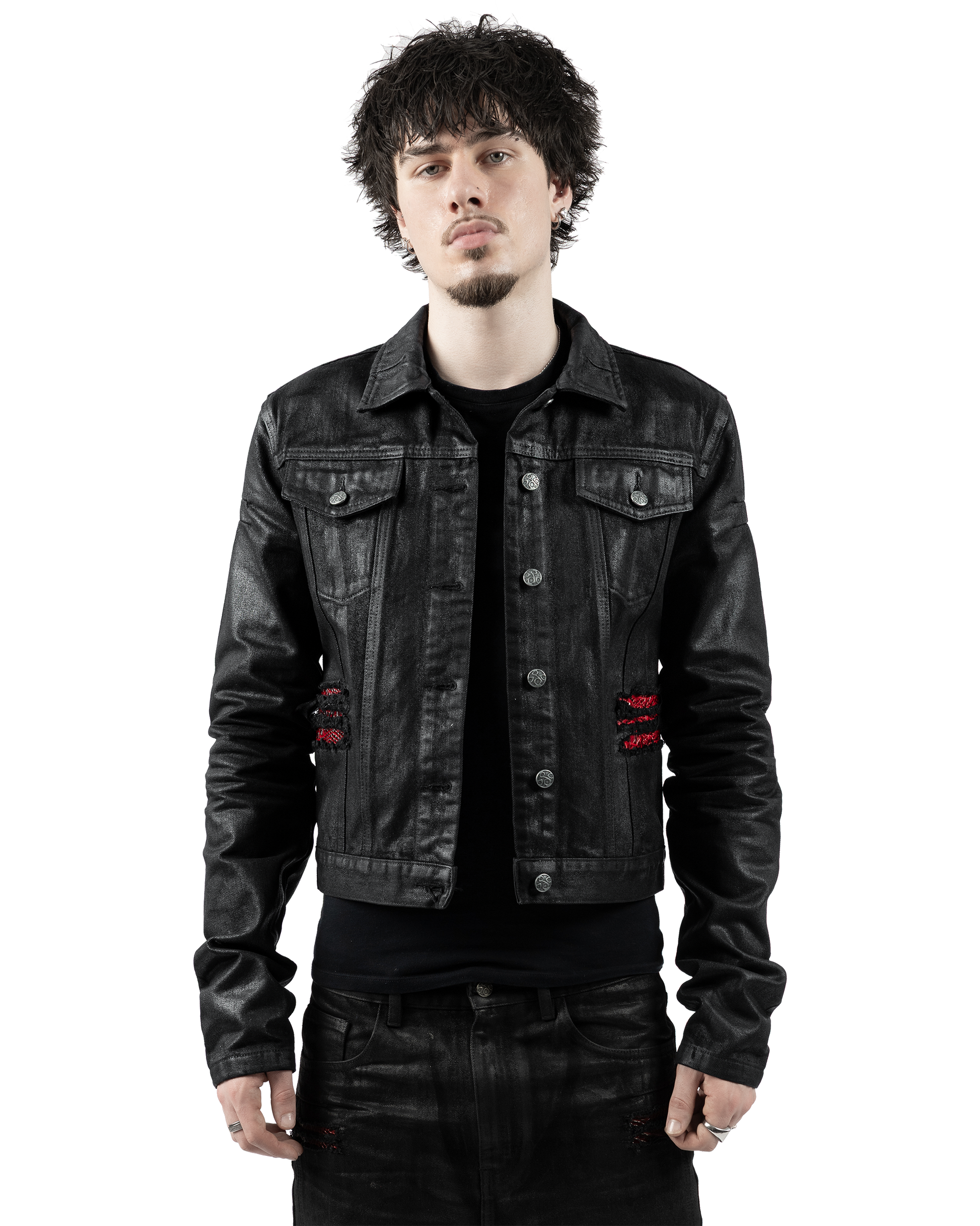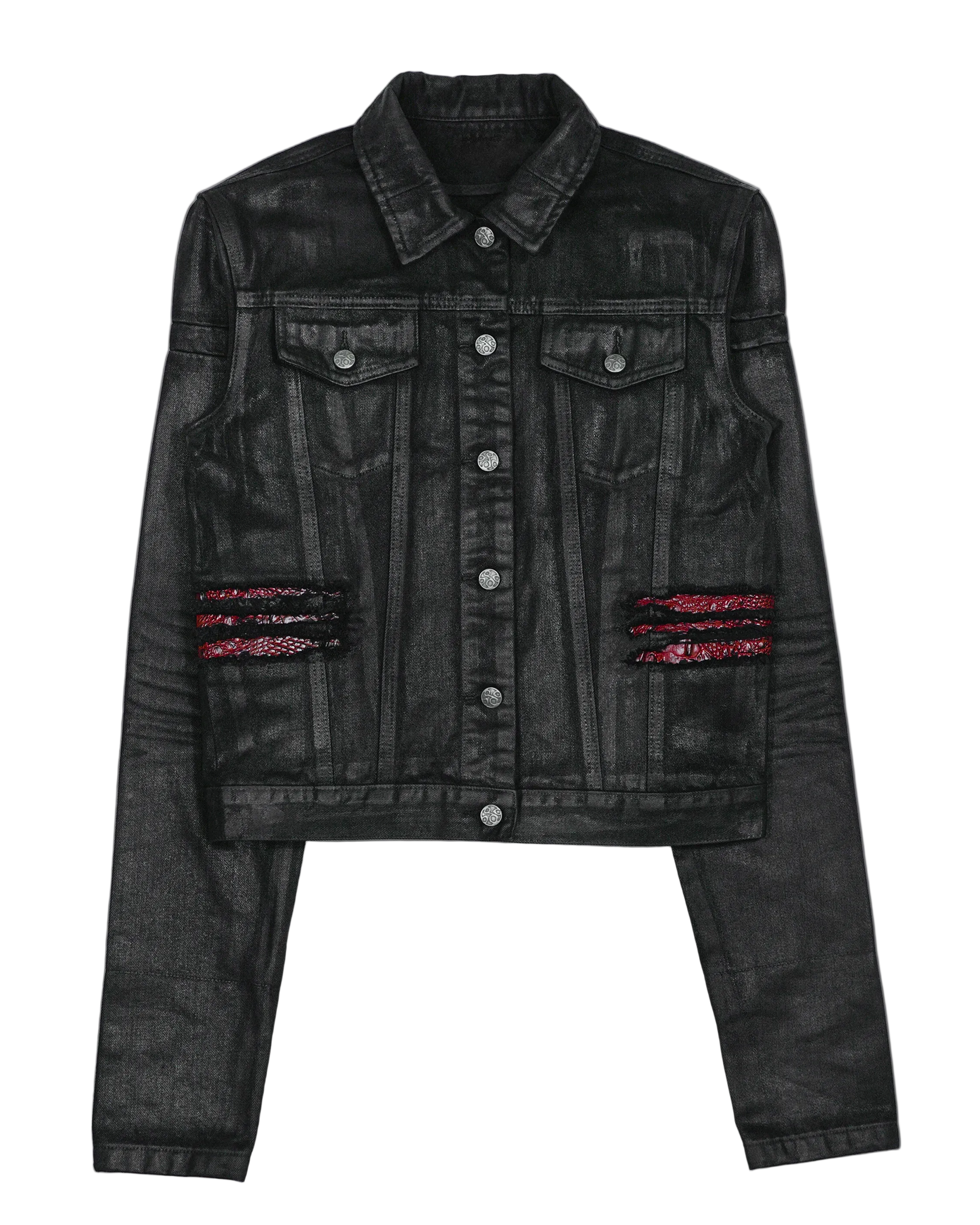 - Dark crocodile-texture PU leather underlayer beneath distressing
